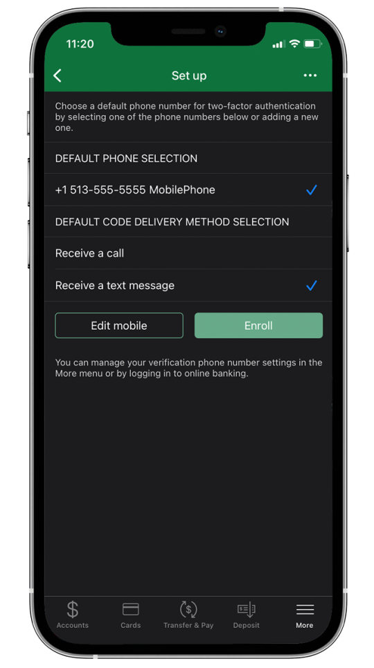When you first set up your CSB Online Banking account, you'll be prompted to verify your account with two-factor authentication. This is a quick and simple process to verify your identity by providing a code you receive by text or phone call to a number you provide.
